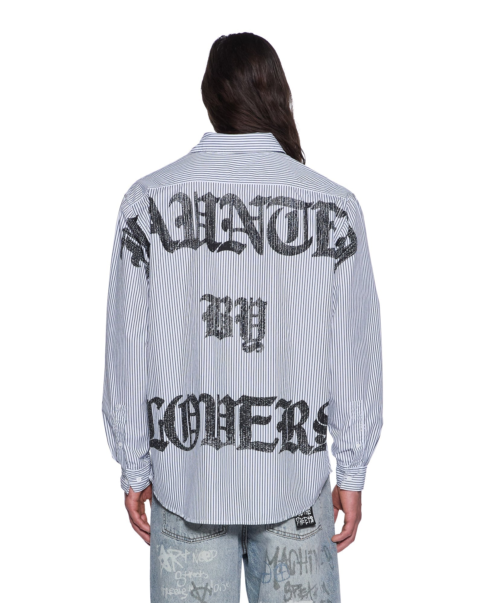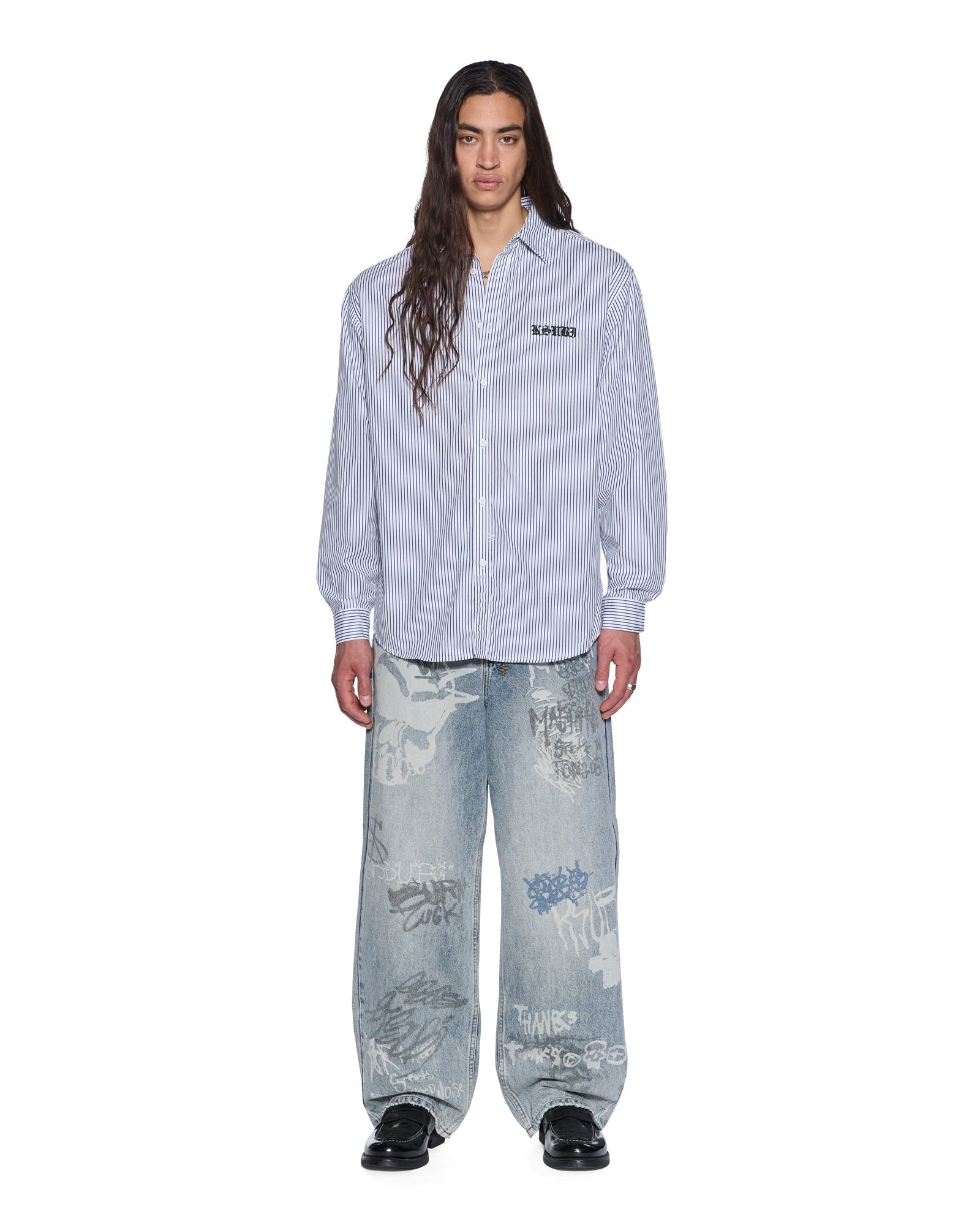 The Haunted KSignature Long Sleeve Shirt Black Stripe is a relaxed-fit button-down with long sleeves, a button-down collar, and a scooped hem. Made from midweight premium cotton striped shirting in black and white, it features seasonal artwork printed on the front and back, finished with T-box and 4x4 embroidery and Ksubi hardware.