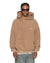 The 1999 Ekcess Hoodie Elk is a boxy oversized fit hoodie featuring a single piece hood, front pouch pocket, and signature rats tail. Made from heavyweight inverted loopback fleece in Elk, it includes seasonal front embroidery, metal hood plate, and tonal T-box and 4x4 embroidery.