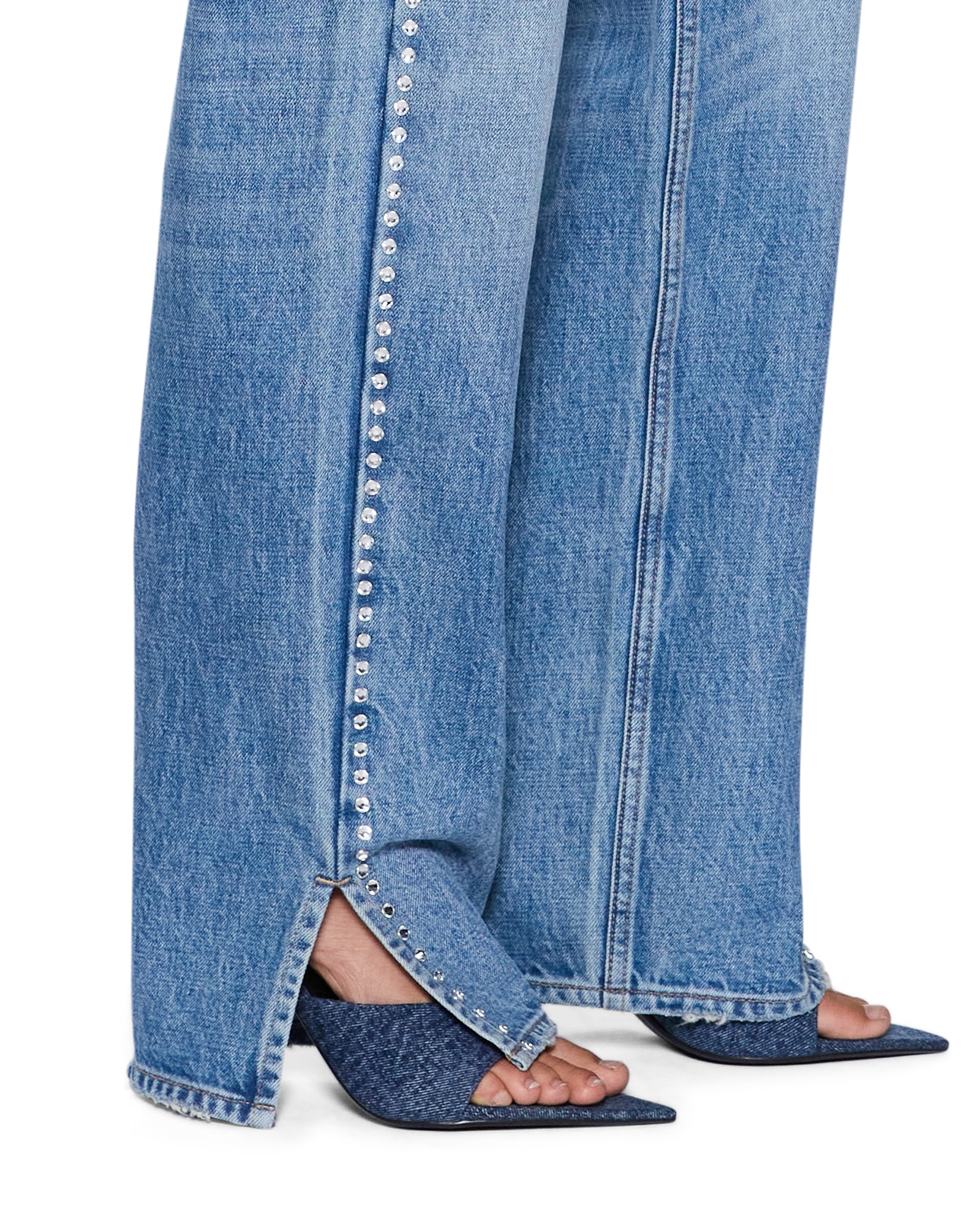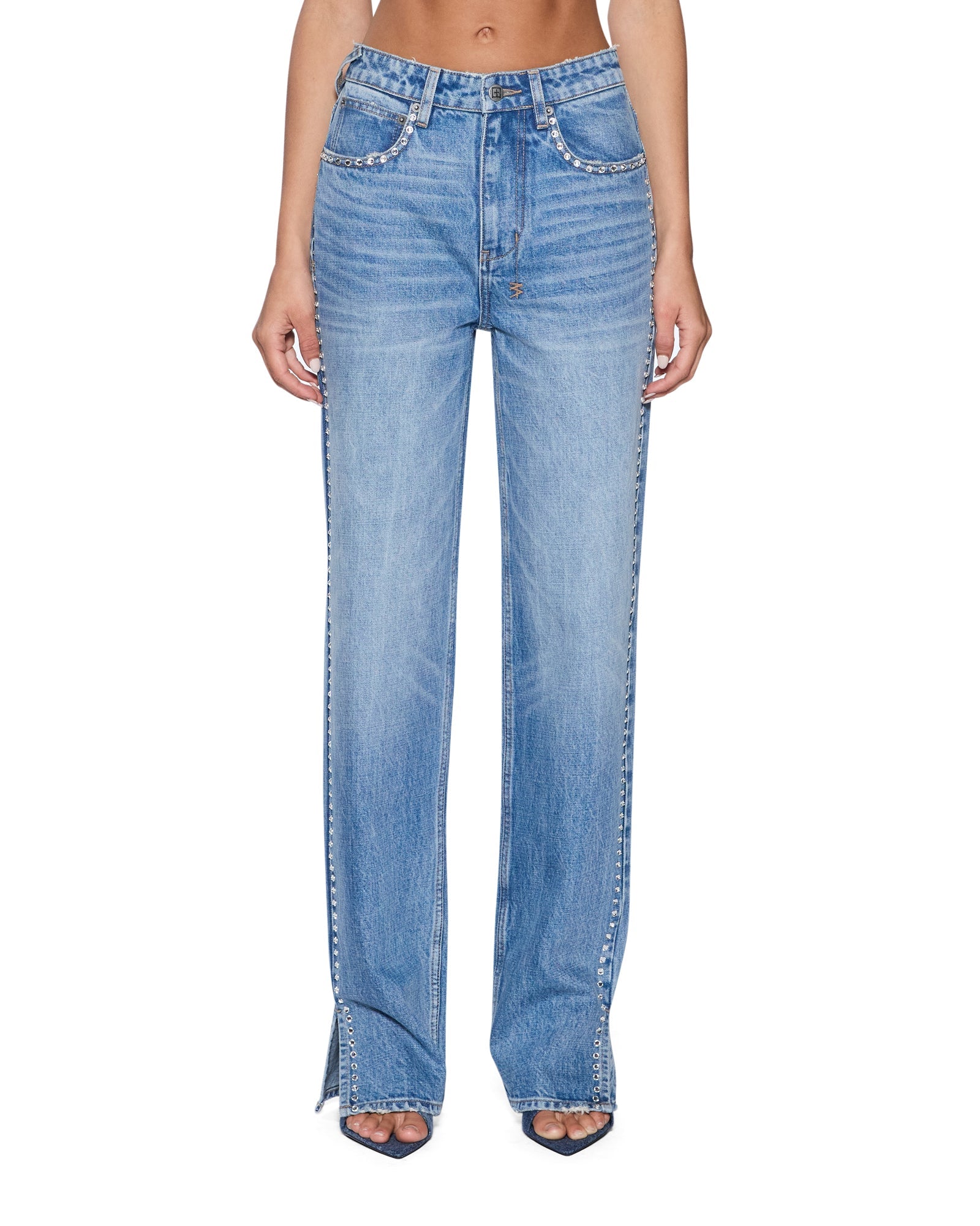 The Playback Jean 2.0 Maverik Krystal is a modern update to the iconic Playback silhouette, featuring a straighter leg opening, relaxed fit through the seat, and slightly shorter rise while maintaining a full-length, high-rise shape. Crafted from premium rigid denim with a vintage mid-blue stone wash, worn-in wear patterns, and tobacco topstitching, the style is finished with diamante studs along the front pocket openings, down the side seams, and around the back pocket edges for an elevated statement aesthetic.