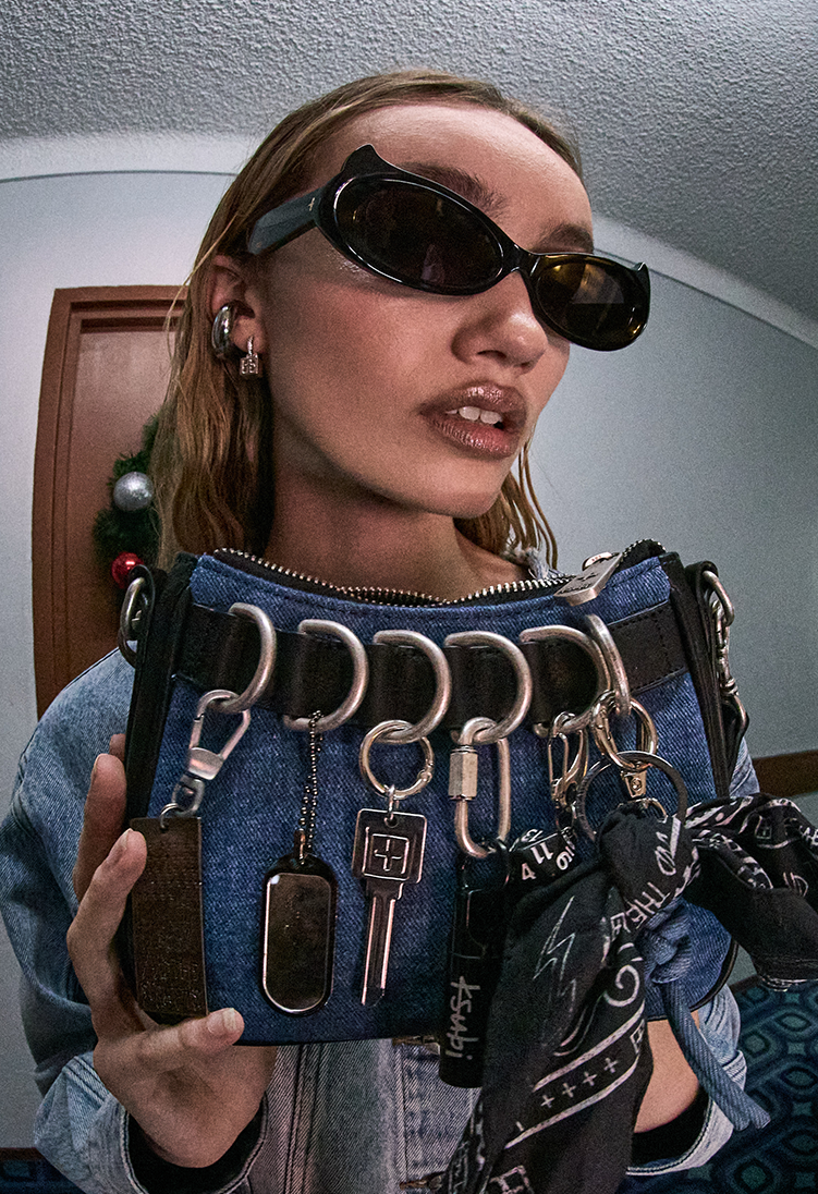Cool machine wash with like colours, wash inside out, do not bleach, remove promptly after wash, do not tumble dry, cool iron on reverse, do not iron directly onto prints or metal hardware, colour may transfer onto other garments and upholstery.