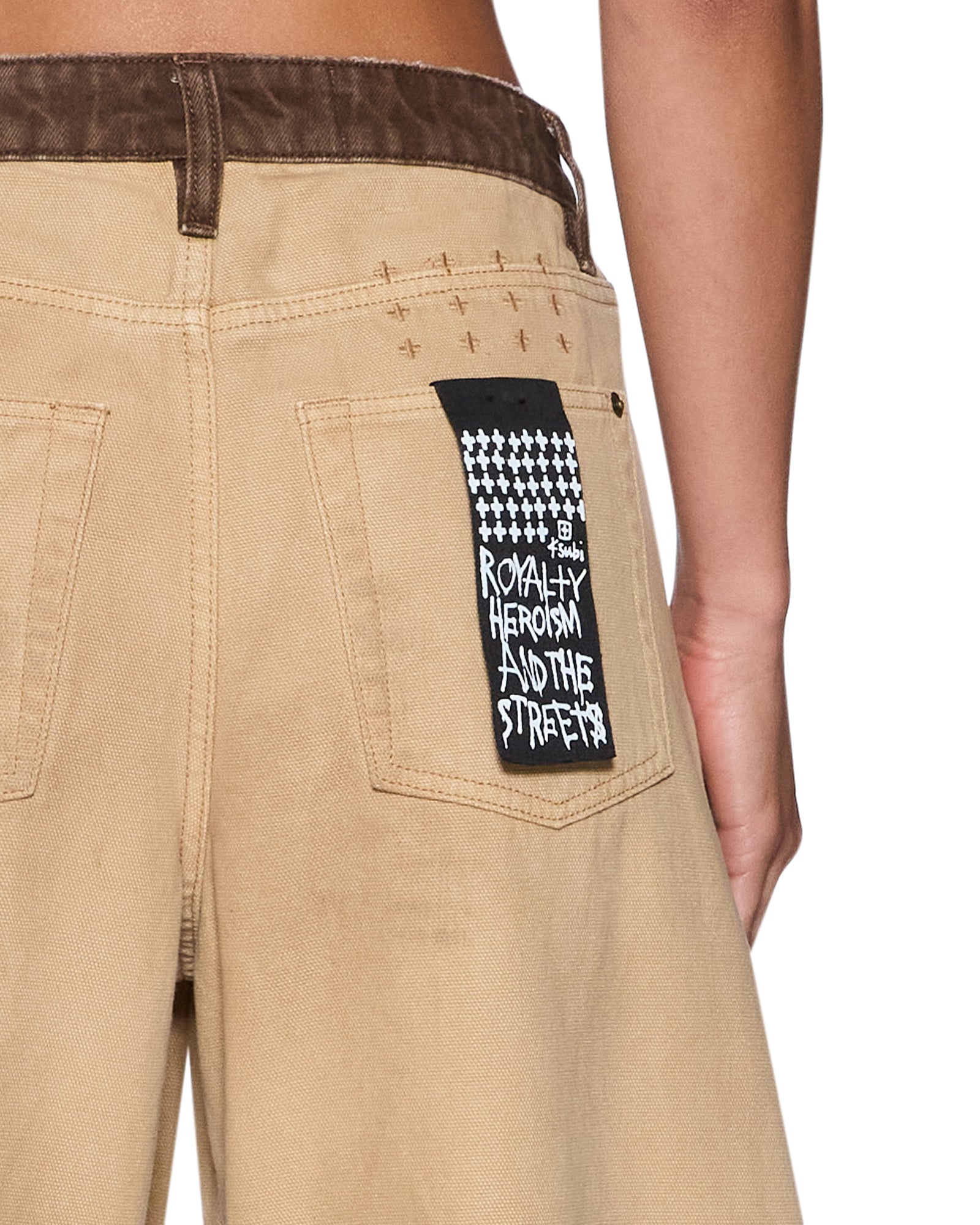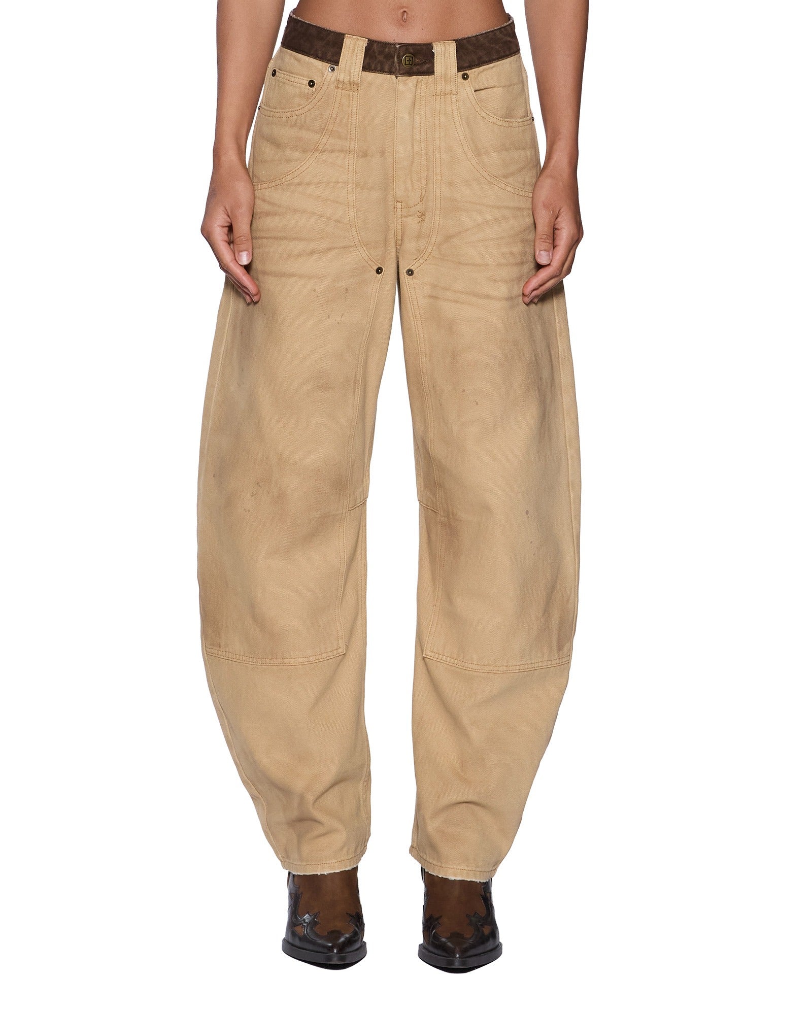 The Barrel Jean Carpenter Jean Sierra Tan is a mid-rise, relaxed fit jean with a distinctive barrel-shaped leg that tapers at the ankle. Made from heavyweight 100% cotton nailhead canvas in an overdyed tan colourway, spliced with chocolate brown denim at the waistband, it features partial grinding at the waistband, pockets and hem along with subtle oil stain splashes. Finished with classic five-pocket styling, anti-brass Ksubi branded hardware, and signature t-box and 4x4 embroidery, with a removable pocket tag at the back.