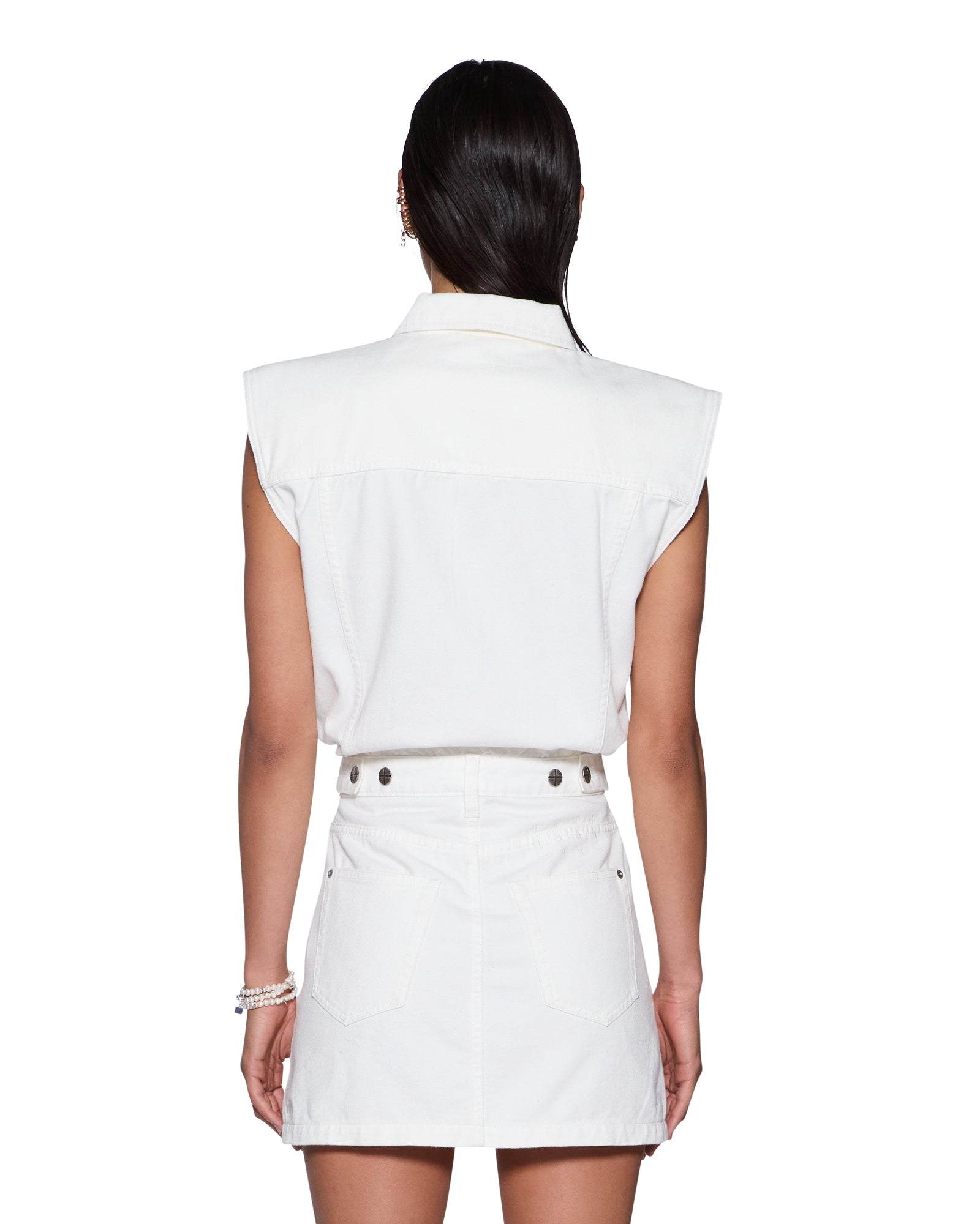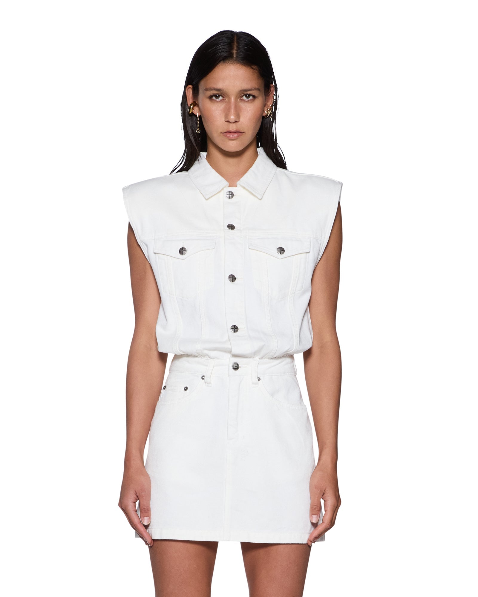 The Form Up Boilerdress Blanc is a sleeveless shirtdress designed with a relaxed blouson bodice and fitted mini-length skirt silhouette. Crafted from premium rigid lightweight white denim, the style features a button-up collar, classic denim panel lines, encased shoulder pads for a strong structured shape, trucker-inspired panelling, and is finished with anti-silver Ksubi branded hardware, 3x4 and T-box embroidery.