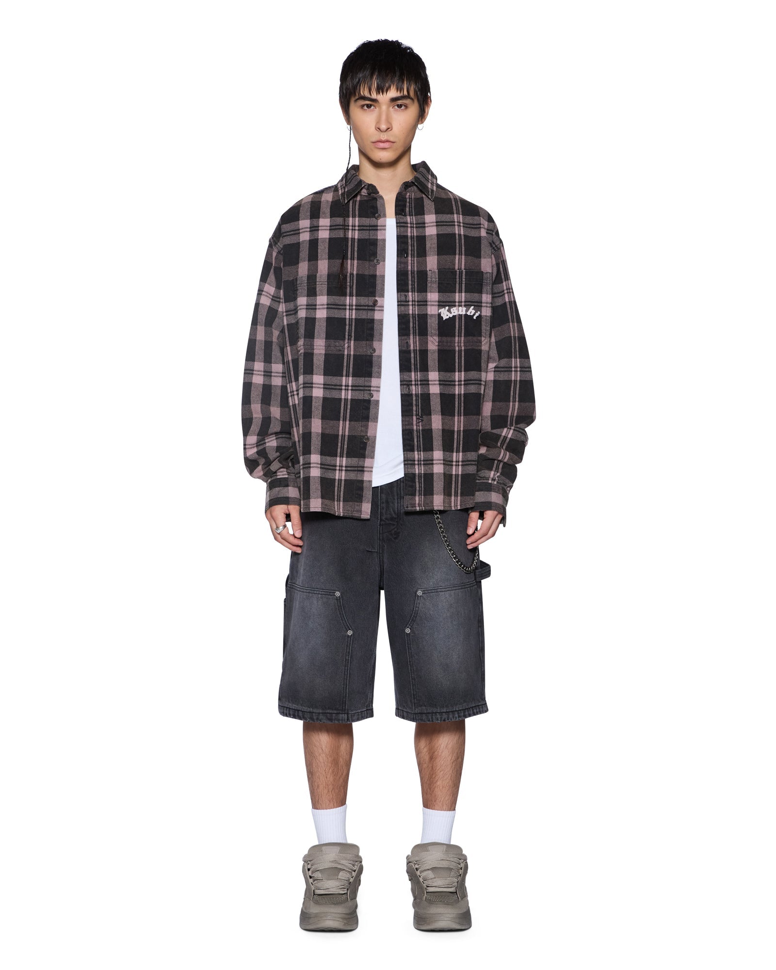 The Vulture Flannel Shirt Plum is an oversized long-sleeve button-down flannel shirt with a scooped back hem, cut from soft cotton flannel in a black check pattern and treated with a softening garment wash. Designed with chest pockets featuring button closures, a front buttoned placket, and seasonal chain stitched Ksubi embroidery on the front pocket and back, it’s finished with signature T-box and 4x4 branding and Ksubi branded hardware.
